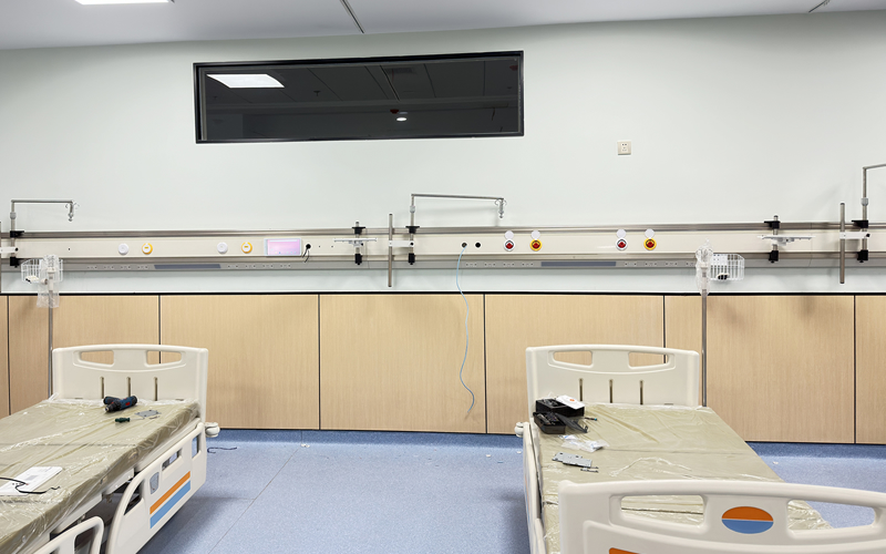 CCU病房采用多功能導(dǎo)軌式設(shè)備帶,床頭配置可移動式導(dǎo)軌托架、掛鉤、器械框以及醫(yī)用氣體和醫(yī)護(hù)對講設(shè)備。