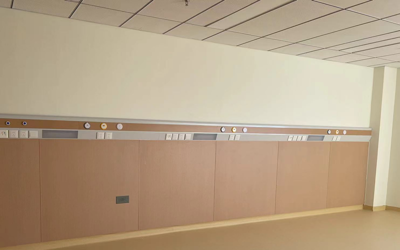 普通房間床頭安裝鋁合金設(shè)備帶,配有氧氣和吸引端口、電源插座及床頭照明設(shè)備。