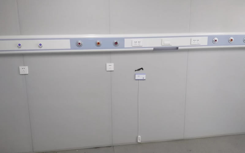 方艙醫(yī)院病房床頭安裝醫(yī)療設備帶,每個床位配備一個氧氣終端口、一個吸引終端口、一個空氣終端口和電源插座床頭燈以及緊急呼叫對講設備。