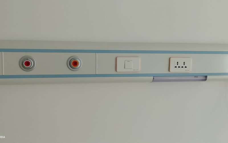 病房床頭選用優(yōu)質(zhì)鋁合金防靜電設(shè)備帶,中心供氧終端選用較為高檔的德標(biāo)制式氧氣終端,以及德標(biāo)真空負(fù)壓吸引終端。普通病房每個床位配置一個氧氣終端、一個吸引終端、一個六孔電源插座、一個LED閱讀燈、一個呼叫對講系統(tǒng)分機。