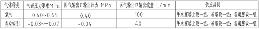 13、各種氣體氣源壓力要求、醫(yī)氣輸出口壓力、流量參數(shù)、醫(yī)氣輸出口種類及數(shù)量見(jiàn)下表: