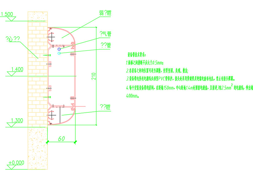 4.每個(gè)安裝設(shè)備帶的房間,在距墻150mm,中心距地1.45m處預(yù)留電源盒,且接進(jìn)3組2.5mm2的電源線,伸出墻400mm。
